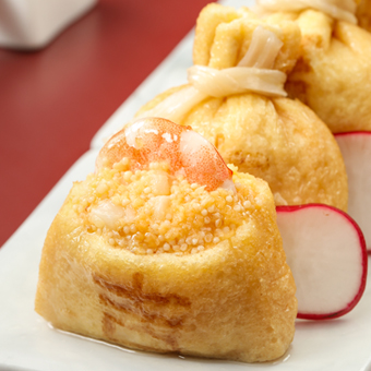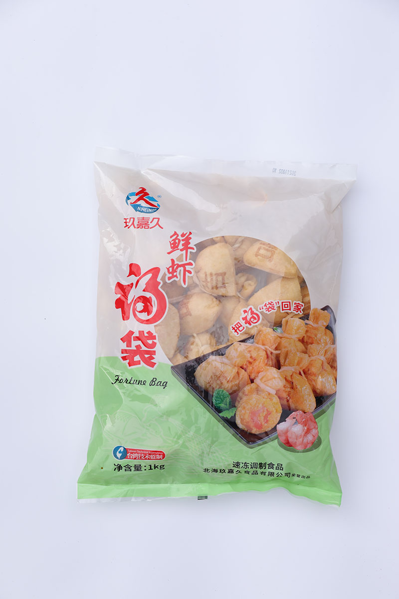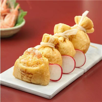 產(chǎn)品特性:采用優(yōu)質豆皮包裹蝦仁、魚漿和魚籽,外皮印了一個“吉”字,意頭十足,形狀如袋子故稱福袋!