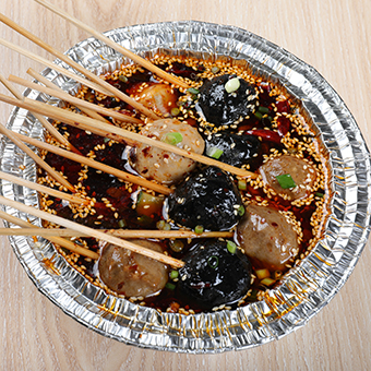海豬肉丸解凍,麻辣湯底煮開,放入丸子煮8分鐘,撒上蔥花即可。