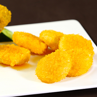 墨魚餅提前解凍,然后裹上面包糠,放入熱油中炸6分鐘即可。